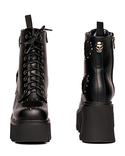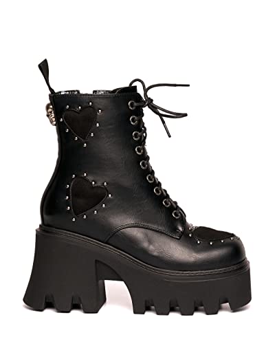 Alle I Need Chunky Platform Enkellaarzen in zwart. Kenmerken omvatten drie zwarte suède harten met een perimeter zilveren studs. Kenmerken ook inbegrepen een verstelbare zwarte kanten up detail met zilveren ogen. Naast een zwarte lus en een zilveren half schedel ontwerp bestand tegen de achterkant van de laarzen. Al onze CHUNKY platform zool.